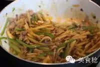 • 等到土豆条和青椒丝被炒软时就可以放入之前炒好的里脊肉了,加入老干妈,喜欢吃辣的同学可以多加点,不爱吃辣的同学也可以不加。
