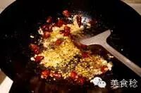 • 锅内少量油,放入蒜末,姜片,干辣椒,花椒,煸炒出香味