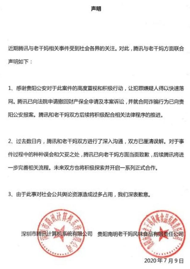 吃瓜群众的瓜终于落地了! 7月10日,腾讯和老干妈发布联合声明称,双方宣布已厘清误解,未来将积极探索并开启一系列正式合作。 这样一场因骗子而起的“假合作”,居然要变成真的了! 腾讯、老干妈宣布和解 先来看看腾讯和老干妈发布的联合声明:  具体来看,该则300字左右的简短声明,主要包含如下三项内容: 第一,双方表示,感谢贵阳公安对于此案件的高度重视和积极行动,让犯罪嫌疑人得以快速落网。腾讯已向法院申请撤回财产保全申请及本案诉讼,并就合同诈骗行为已向贵阳公安报案。腾讯和老干妈双方后续将积极配合相关法律程序的推进。