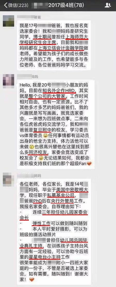 随便点开一张,参选家长全都是海内外名校毕业的研究生,满眼的复旦、同济、密歇根,外企大管家、知名会计所、央行外管局满天飞。他们有钱有闲有热情,有的甚至三年连霸孩子幼儿园的家委会会长。