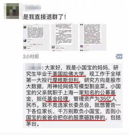 还有的根本不屑于参选,觉得家长们明秀暗撕实在没劲,却也不忘恶狠狠地宣告说,谁敢欺负我家孩子,管理35亿资产的孩子他爸,“会把你的股票砸跌停的,包括茅台”,让人看了瑟瑟发抖。