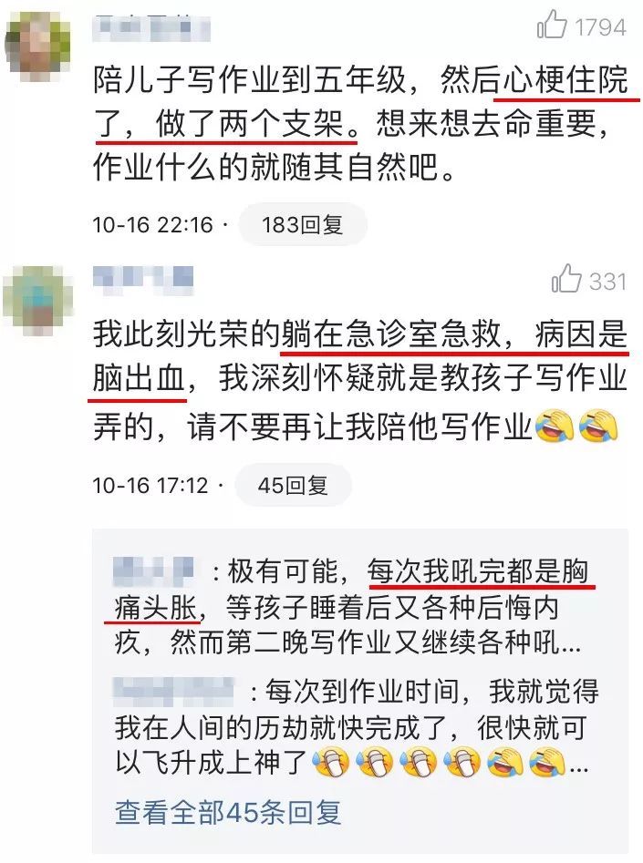 对于奋战在陪读第一线的中国爹妈而言,咆哮只是开胃小菜。据非官方不完全统计,“陪孩子写作业”,已正式入选为“请勿模仿的高危工作”。 有家长说,自从开始吼娃,才知道“气到胸口疼”、“憋出内伤”不是一种修辞手法,而是真实写照。