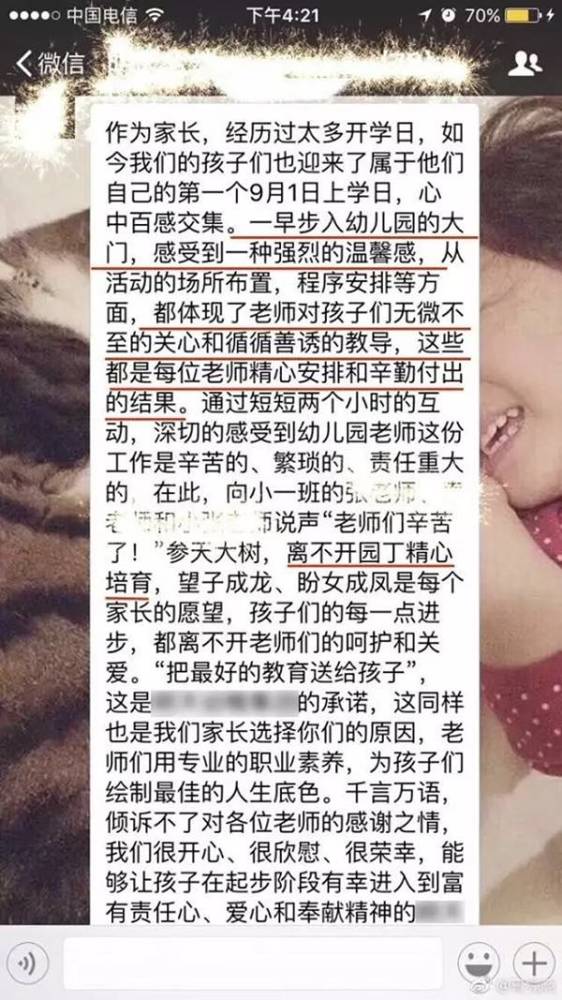 媒体从业者不是唯一的背锅侠,张二栓说,为保证资源的最大化利用,老师会与家长沟通,发掘各家资源,举办各类活动。 比如,你是记者,那借你们单位名义,搞一个小小记者的活动吧,于是,乌央乌央的小小记者,涌向编辑室,参观,学习,发表感想。 比如,你在税务局工作,那让孩子们体验下小小税务员的工作吧,无奈,你带着一群孩子,挤在税务大厅,旁观办税。 第四关:不是戏精的家长 不是好家长 前不久,微博上就有网友吐槽过家长群里的“戏精们”。 开学当天,家长们就在幼儿园参观了两小时,随后便在微信群里,掀起了500字小作文大战。