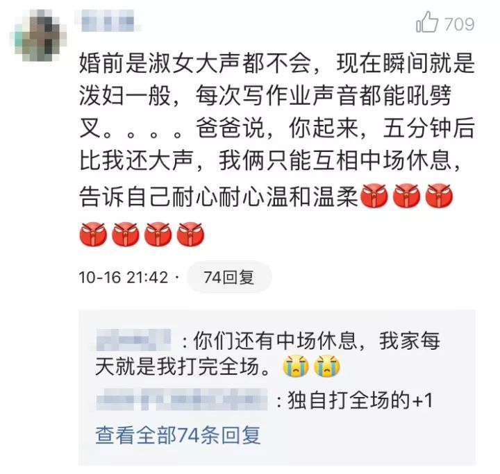 每个学龄娃背后 必有一对崩溃的爹妈 我认识一位母亲郝漂亮,儿子正读小学三年级,她是这么描述自己的心里路程的:每天的战斗,从睁眼开始。 因为要陪孩子读书,郝漂亮的手机里,没有王者荣耀,没有开心消消乐,一半以上内存,全贡献给了各种教育app。 有孩子前,郝漂亮朋友一片,隔三差五,几个好友勾肩搭背,吃饭,逛街,搓麻。 有孩子后,郝漂亮成天只能围着孩子转。朋友约饭,想去,但瞅着孩子磨蹭半天也没做完的作业,只能婉拒。 久而久之,身边朋友渐渐失联。现在,郝漂亮的人际圈,除了同事,就是接送孩子时认识的,和她一样,在寒风中瑟瑟发抖的其他妈妈。