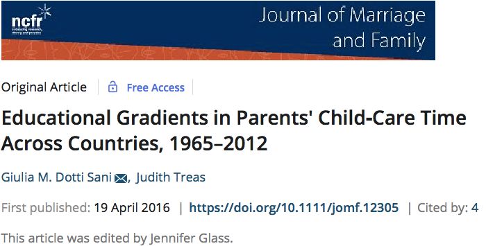 因为九年义务教育的“强制性”,不同家庭背景孩子的净入学率和学习时间差异不大,但孩子的知识、学历能够达到怎样的高度,学前和高中以后的教育至关重要。《时间利用报告》却发现,在学前和高中阶段,农村、低收入、低学历家庭的孩子净入学率更低、学习时间更短。 这也与之前“母亲学历越高,子女被照料的时间越长”的结论相印证。因为,普遍来说,学历越高,收入也就越高。 女性受教育程度在不断提升是社会整体趋势,但伴随而来,是越来越多的女性“回归家庭”。 《时间利用报告》指出,从2008到2017年,我国女性、男性的总劳动时间比由1.10下降到1.05,其中有酬劳动时间比由0.73下降到0.69,无酬劳动时间比由2.60上升到3.15。女性有了从照顾家庭、赚钱养家的“双重负担”向家庭回归的趋势。 全球趋势:高学历母亲回归家庭 学历越高的女性,在照顾和教育子女上花的时间越多。这一趋势在全球、尤其是发达国家同样明显。 2016年,加利福尼亚大学欧文分校的学者就对此作了一份调查。他们对11个西方国家父母陪伴孩子的时间进行了统计,时间跨度长达48年(1965年—2012年)。学者们发现,教育程度越高的父母,陪伴孩子的时间越多。 研究中所说的“陪伴”不仅包括读书和辅导家庭作业,还包括做饭、洗衣服、看病、玩耍等。