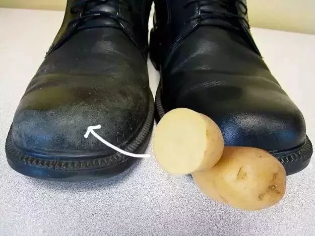 在给皮鞋打蜡前,先用生马铃薯摩擦皮鞋表面有划痕的地方。