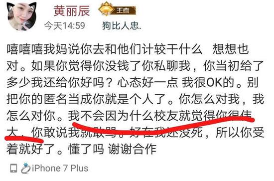 近日,有了解黄丽辰家境的校友在QQ上对其发起筹款的做法提出质疑。对此,黄丽辰通过其QQ空间发布多条动态回骂称,“**给了多少,我给你报销好吗……我妈能挣钱关你什么事?老子家里住的房就算几百万关你什么事?”、“我妈挣的钱也是血汗钱,家境如何不会和你比,可以理解你的羡慕嫉妒恨,能炫的我尽量不会让你失望”、“我不会因为什么校友就觉得你很伟大,你敢说我就敢骂”。随后,有网友发帖质疑,筹款人其实家境殷实,家中有房有车有店,质疑其诈捐。同时,在筹款动态中,也有人留言“把钱捐给真正需要的人吧”、“看到后续,让人心凉”。