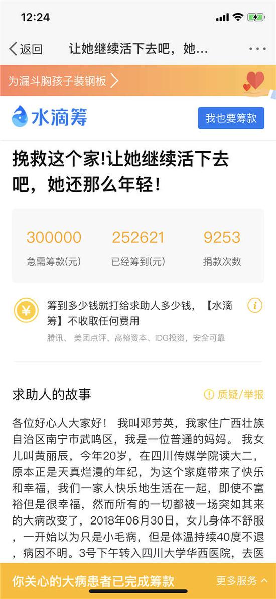 而对于女儿不当言论引发的质疑,24日下午,邓芳英再次在筹款动态中回应,发起筹款前,原本考虑卖车卖房筹钱救命,有病人家属建议通过平台筹款救急,无奈下通过水滴筹发起筹款,得到很多好心人快速爱心捐款。“孩子康复后我们和平台沟通,变卖家产72小时内如数退还筹款给各位爱心人士。感谢各位爱心人士及时援助,挽救女儿的生命。”