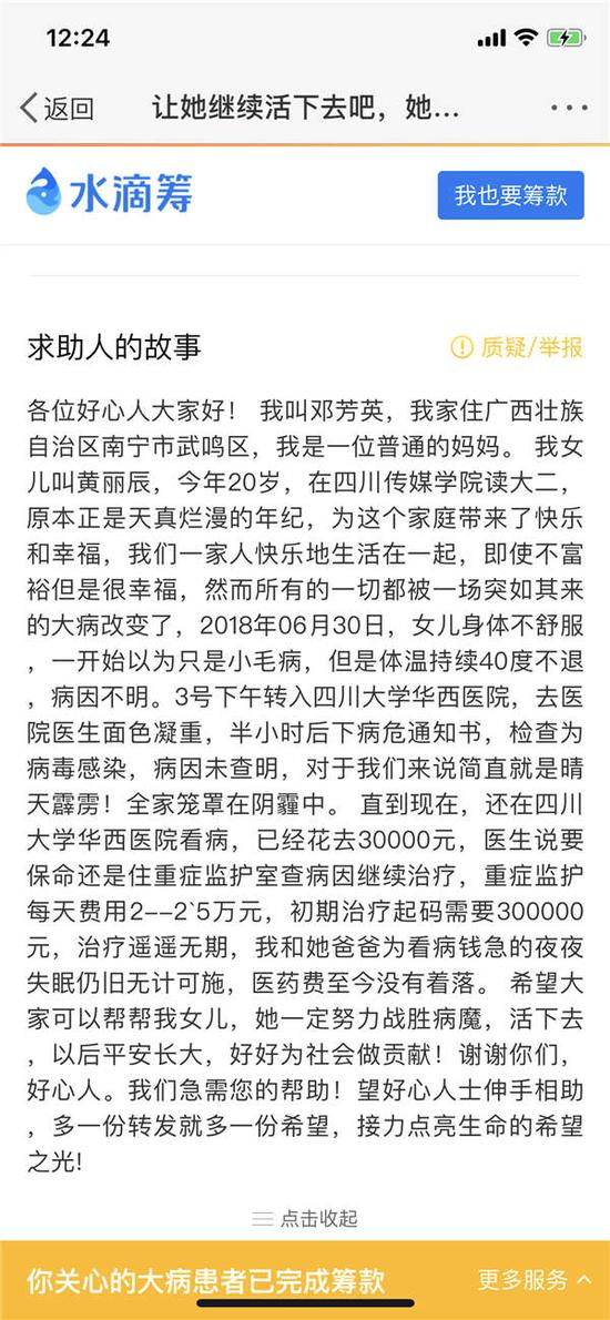 据邓芳英在水滴筹平台发起的筹款项目显示,其筹款目标是30万元,经过2210次转发、9253次捐款,已筹到252621元,并已于7月11日成功提现。发起人在求助人故事中称,6月30日,女儿黄丽辰身体不舒服,一开始以为只是小毛病,但是体温持续40度不退,病因不明。7月3日下午转入四川大学华西医院,半小时后被下病危通知书,检查为病毒感染,病因未查明。截至发起筹款时,治疗已经花去3万元,要保命还得住重症监护室查病因继续治疗,重症监护每天费用2到2.5万元,初期治疗起码需要30万元。“我和她爸爸为看病钱急的夜夜失眠仍旧无计可施,医药费至今没有着落。”同时,发起人还提供了患者的相关资料和医院的诊断证明。