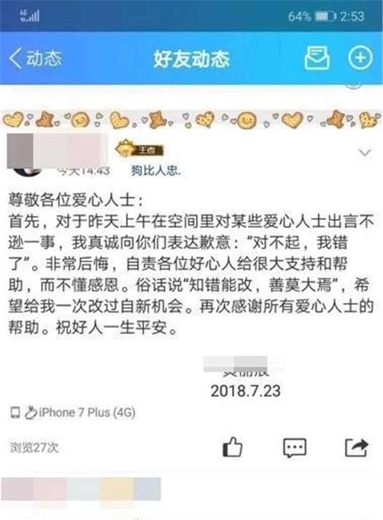 当事人已在QQ空间道歉并决定变卖家产退回善款