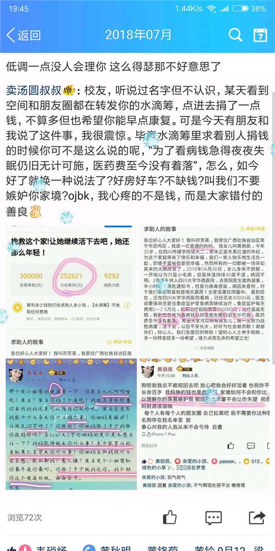 一位在微博转发该筹款链接的网友对北青报记者表示,她跟黄丽辰不熟,只知道她是武鸣高中的一位学姐,当时看到捐款信息,身边十几位同学也都捐了钱,“后来在空间看到别人转发学姐骂人的那些话,还是挺生气的”。