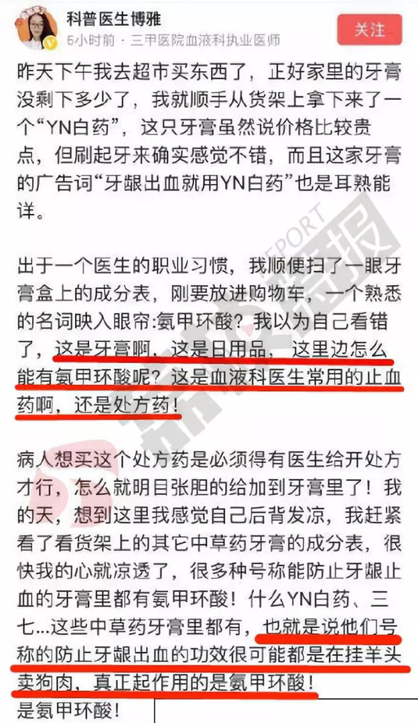 10月21日,网名为“科普医生博雅”的网友发表文章称:云南白药牙膏中含有止血功效的西药成分“氨甲环酸”,而不是云南白药,这些所谓防止牙龈出血、止血的“中药牙膏”,其实都是在挂羊头卖狗肉,起到真正作用的,是西药“氨甲环酸”。“科普医生博雅”还质疑,氨甲环酸是处方药,添加到日用品中可能涉嫌违法添加。