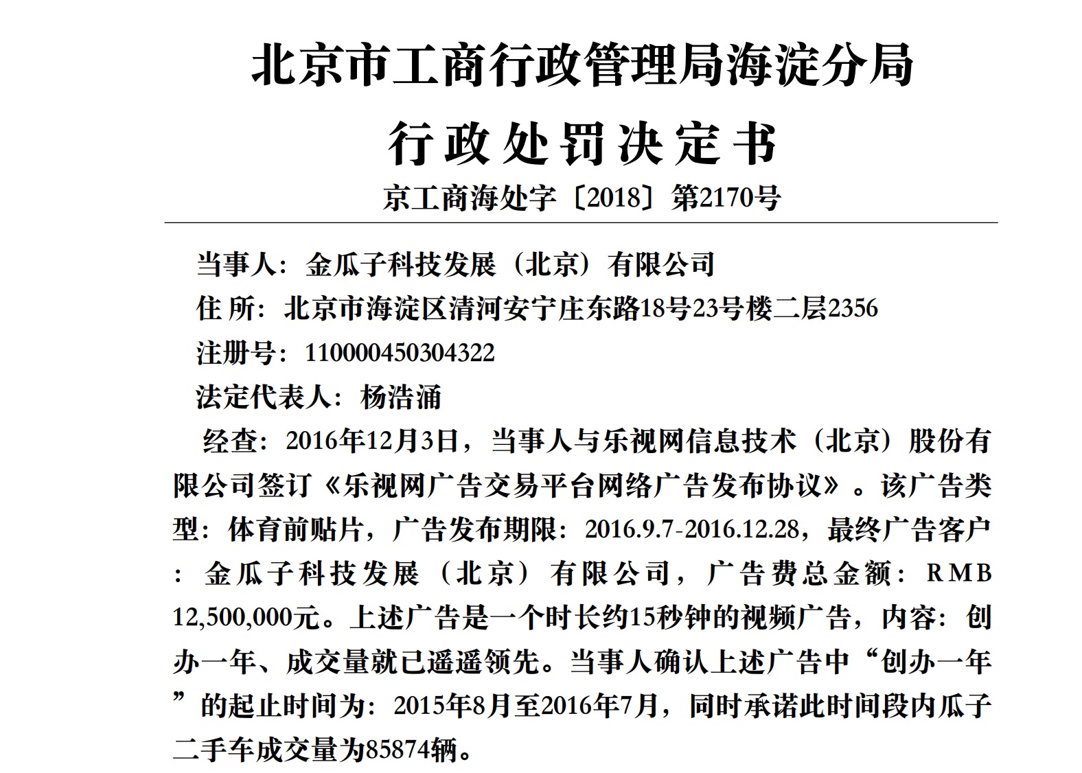 [其他闲聊] 瓜子二手车广告违规被罚1250万元 回应:已申请行政复议