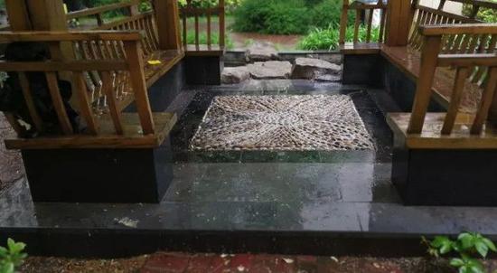 这是一个医院,在医院的住院部旁边有一个小游园,这种小游园可以叫作康复花园。康复花园里面有一个凉棚,然后有一个5厘米的小坎,轮椅车根本上不去。  它还做了个亭子,可是这个亭子台阶很高。
