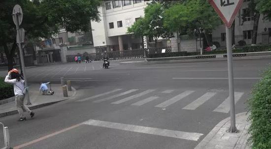 我带学生去实习的时候,突然发现左前方的小孩,他撞到了上面写着“让”字的交通标志。然后这个小孩迅速地爬起来,冲过去,又撞到对面的那个墩。  奇怪的斑马线