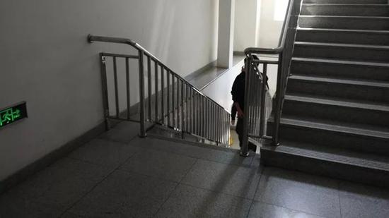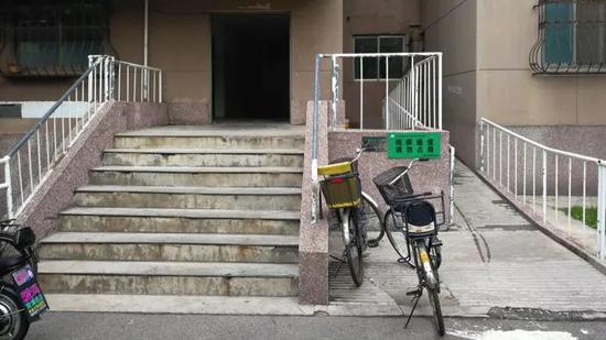 这是我自己居住的一栋楼,这栋楼的设计符合所有的建筑规范。有一天,我回家看到一个老奶奶扶着右边的护栏,她的孩子搀扶着她,把她送上楼梯,然后再回过去推着轮椅从旁边的无障碍通道上去。