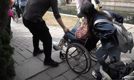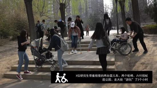当然别的地方确实不能去,到处是坑坑洼洼。大家看到没有,在一个非常大的公园里,真正能够满足这对母女活动的空间非常小,可是这位女士一再向我强调已经很好了,她很满意。 我必须思考的一个问题是,他们的善良为什么没有换来安全、舒适与方便?所以我决定带着我的学生把找感觉开成一门课。每年,我都会和学生一起租上轮椅车、拐杖、婴儿车,穿公园,走大街。我们发现,我们的城市、我们的公园,寸步难行,  寸步难行,