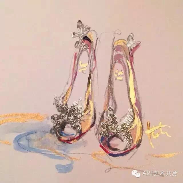 她画笔下的Christian Louboutin 版的灰姑娘水晶鞋,很有灵气。