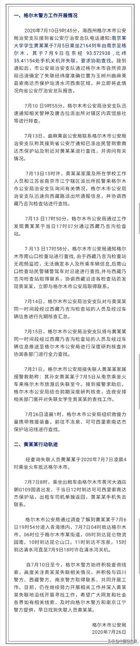 从格尔木公安通报可以梳理出,失踪女生黄雨蒙于7月5日乘坐由南京至格尔木的Z164列车,7月7日凌晨4时抵达格尔木市。
