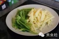 放入土豆条和青椒丝快速翻炒,加盐,炒匀。