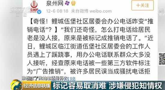 中国人民大学民商法研究中心副主任 姚欢庆:所有的平台在没有经过电话号码所有人同意的情况下,直接就把被标记的信息呈现出来,是不对的,哪一个平台标记的都不行。 号码涉及公共利益个人隐私 标记莫任性 诈骗或骚扰电话,会给大家带来极大的困扰,但恶意标记本不是此类电话的号码,则侵犯了用户的个人权益。 因此,提供电话标记业务的互联网平台应该承担起主动核实的责任,尤其是涉及到个人隐私方面的信息,更是要加大审核力度。同时,电信运营商更应该从起始点加强审核过滤,从源头上阻断这类行为的发生。 另外,提高违法成本自然是有效措施之一,法律学者呼吁电话标记的相关法律法规早日出台。我们也应该从自己做起,审慎标记电话号码。
