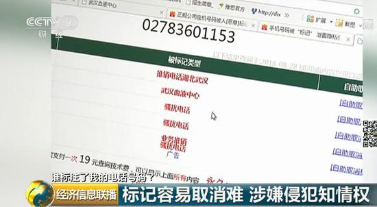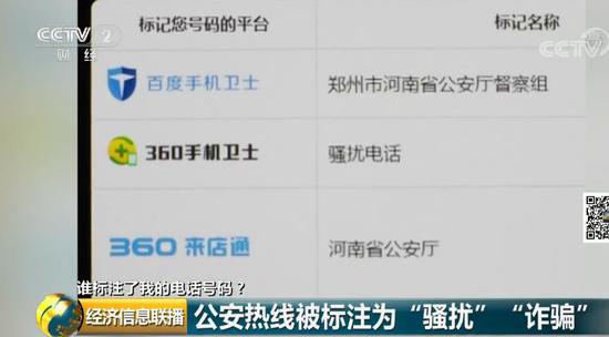 记者:如果公共电话、举报电话被人标记成骚扰电话或者诈骗电话,可能您再打出去,别人就不会接了。 河南省公安厅办公室工作人员:对,这个问题确实很严重。你如果不反映这个问题,我们还不知道,我们先调查一下。 标记容易取消难 涉嫌侵犯知情权 记者经过调查发现,目前,河南、河北、广东、广西等地公安厅的电话都被标记了不实信息,有的甚至是被恶意标记为“快递电话”“中介电话”。一些个人的身份信息也在五花八门的手机标记功能下公之于众,而因为电话号码被错误标记的情况越来越多,一些网站也做起了收费查询标记来源的买卖。
