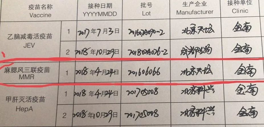 家长C也遇到了同样的问题,卡介苗和乙肝疫苗都没有批号;同时他还发现自己孩子注射的乙脑、麻疹以及百白破疫苗4针中的3针也都过期了。
