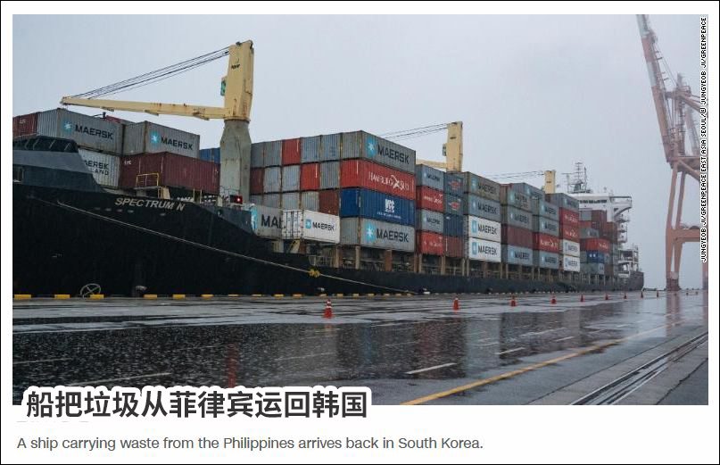 新的垃圾出口地 自中国颁布“洋垃圾”禁令以来,韩国一直将东南亚作为其许多不可回收垃圾的出口地。 目前,韩国向菲律宾出口的垃圾是之前的10倍,向泰国出口的垃圾是之前的30倍。值得注意的是,并不是所有被出口到国外的垃圾都是经过了合法处理的。 此前,一艘集装箱船停靠在首尔西南海岸的港口,船上有51个集装箱,里面装着混合垃圾,这是韩国公司Green SoKo去年出口到菲律宾的。 该公司声称这些垃圾是可回收的塑料,但实际上大部分都不是可回收的,它们散布在棉兰老岛4.5万平方米的土地上。 当地居民发现这些垃圾包括生活垃圾、用过的尿布、空火腿罐头和洗衣机零件。环保组织生态废弃物联盟(EcoWaste Coalition)组织的抗议活动向韩国政府施压,要求收回这些垃圾。  CNN报道截图