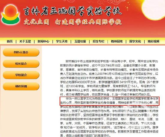 ▲玉琨学校网站简介显示,该校以国学文化为特色,用中医教育保障学生身体健康,用辩经教育开发学生的心智。图片来源:网页截屏