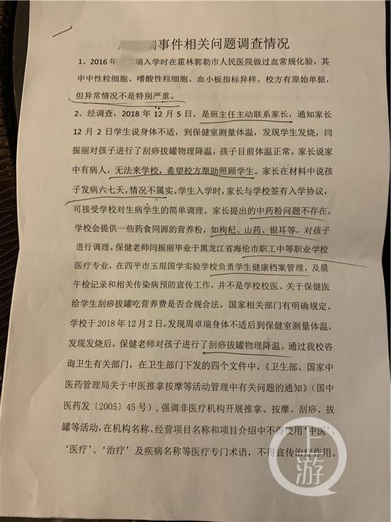 在伊通县教育局提供给周建奎、向小燕夫妻的《睿睿事件相关问题调查情况》(以下称《调查情况》)显示,玉琨学校12月2日发现睿睿身体不适到保健室测量体温,发现发烧后,保健老师闫振丽对孩子进行了刮痧拔罐物理降温,“学生生病期间,学生自己要求喝粥,不是家长说的每天半碗,而是每顿有粥和面食。”